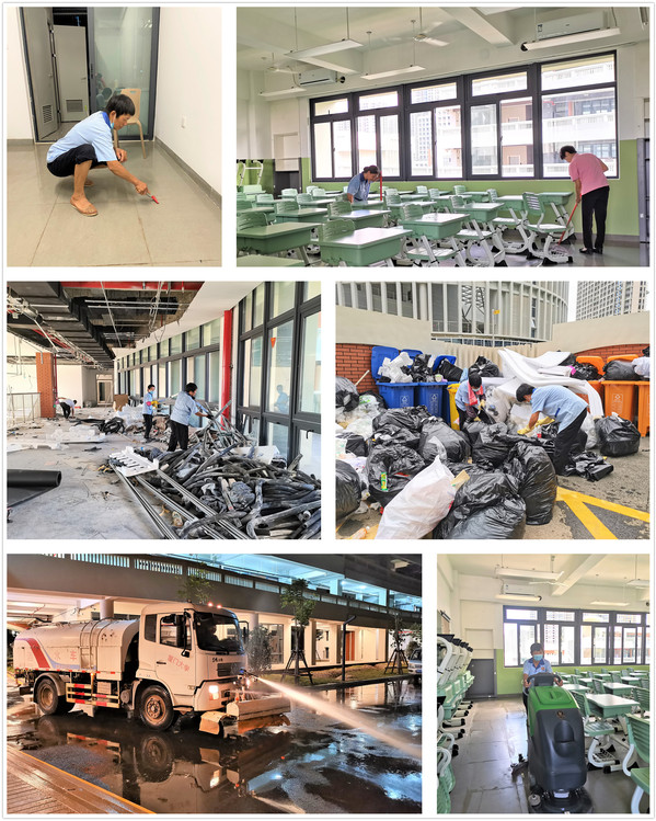 为确保学校迎新、开学工作的如期进行,南强物业自8月1日正式入驻学校之日起,就制定了保洁开荒工作方案,抽调周边项目员工积极配合,成立开荒团队,克服时间紧、任务重,极端高温天气的影响,配合学校设施、设备进场安装,紧张有序地进入开荒行动。