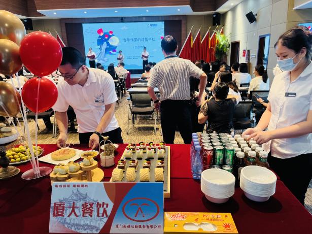 除了送月饼之外,各家餐厅还举办了丰富多彩的主题活动。建发集团厦大餐厅隆重推出中秋美食节活动,通过美食展示、甜品鉴赏、特色小吃、抽奖互动等多个活动区,为建发员工献上一场中秋美食盛宴,凤鸣金秋、人月双圆、阖家团圆、荷塘月色、金玉满堂……一道道寓意美好,色香味俱全的菜品,传播着厦大餐饮用心做菜、用爱服务的宗旨。