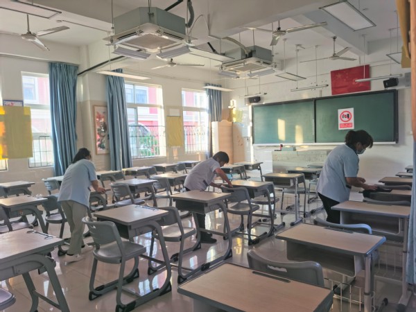考前,工程人员对80间考场内线路、风扇、空调等设备进行了全面检修排查,维序员进行考前消防演练,同时安排保洁提前做好考场及校内公共区域的全面清扫及消杀工作,保障考生的防疫安全。