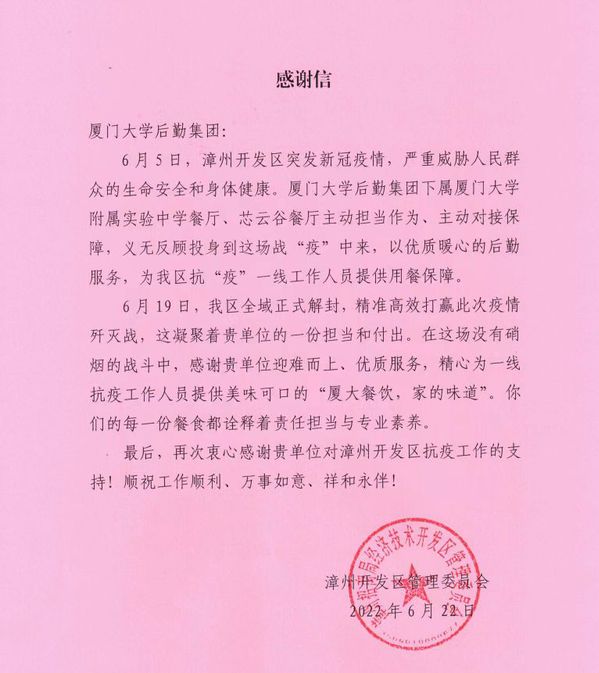 6月23日,集团收到了一封特殊的感谢信。在信中,漳州开发区管理委员特别感谢集团饮食服务中心漳州校区餐饮部(以下简称漳州餐饮部)厦大附中餐厅、芯云谷餐厅“在此次漳州开发区突发疫情防控工作中“主动担当作为、主动对接保障,义无反顾投身到这场战‘疫’中来,以优质暖心的后勤服务,为我区抗‘疫’一线工作人员提供用餐保障”。