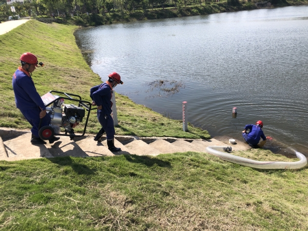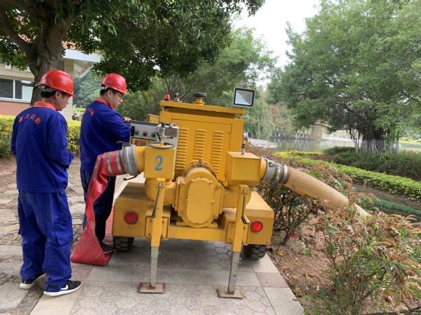 翔安校区水电管理部开展防汛应急响应演练,模拟校园低洼区域积水,启用排涝泵人工排水作业