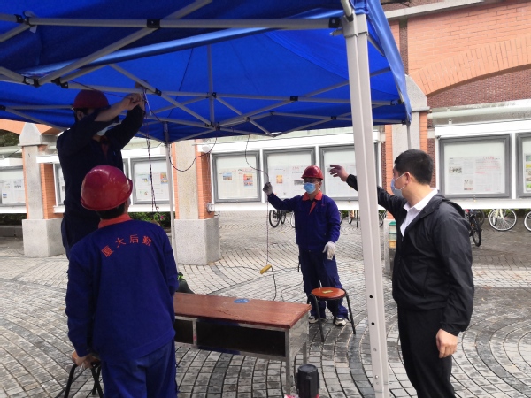 3月19日,接学校思明校区临时核酸检测点用电需求任务,工程维修部随即调配人员,突击施工,圆满完成思明校区9个临时核酸检测点的电源、照明灯布设,保障临时全员核酸检测工作顺利展开。