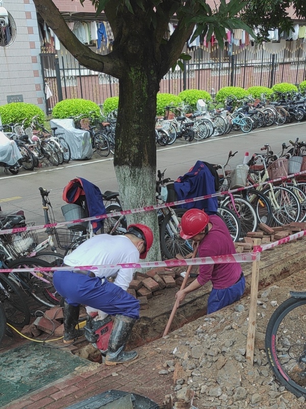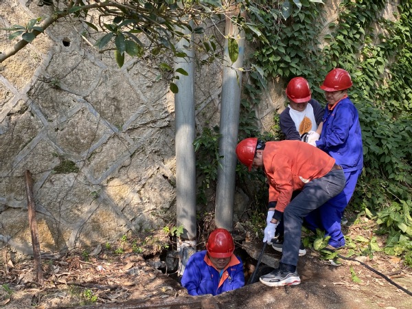 3月24日,中心员工完成核酸检测用电保障后,稍事休整后即刻冒雨抢修迁移芙蓉隧道西端北侧消防水管。
