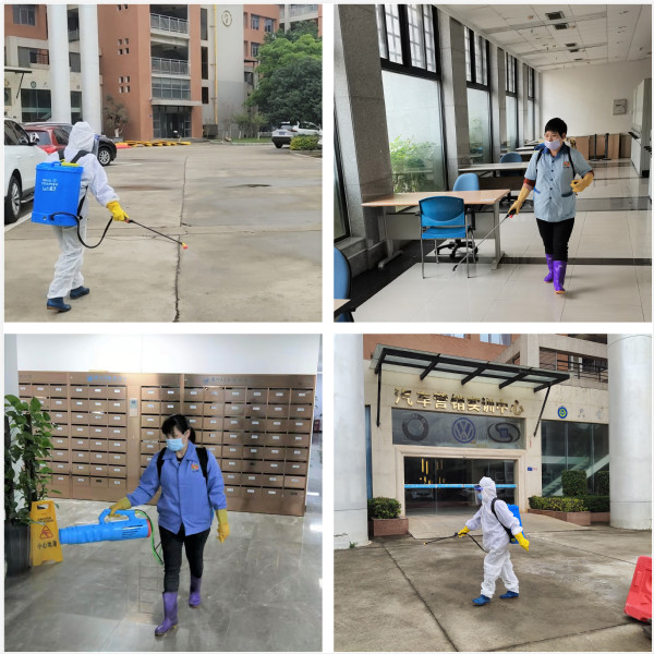 强防疫,勤消毒。公司各项目结合疫情防控工作要求,在大清洁过后,立即安排人员定时对所托管区域的公共楼道、公共绿地、地下车库、教室、办公室等区域集中消毒,通过全面、高强度消毒,有效切断病毒传播途径。