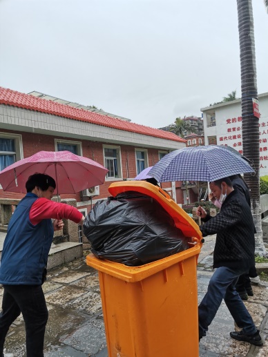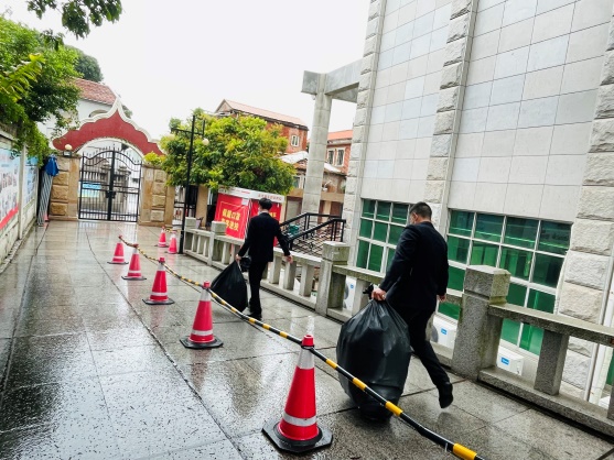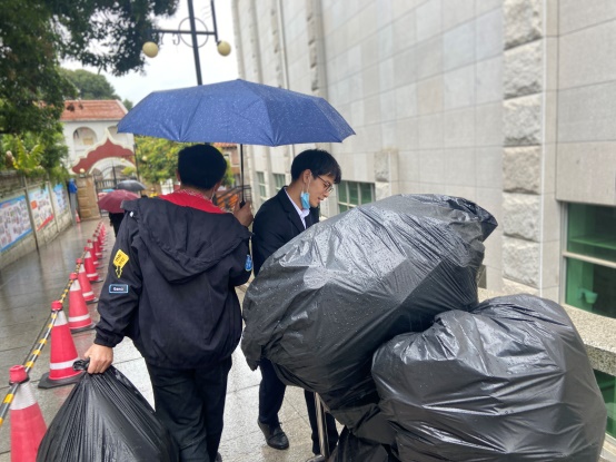 师生们结束用餐后,志愿者们需要去回收保温箱与餐盒。大家将一袋袋厨余垃圾装好,然后搬运至校门口的回收处,在搬运途中还要小心垃圾袋破损而导致垃圾满地,当垃圾散落时大家主动将其清理干净,保持好干净整洁的校园卫生环境。28日那天下了一整天的大雨,撑伞不便于搬运,公司志愿者们就在雨中送餐与搬运厨余垃圾。