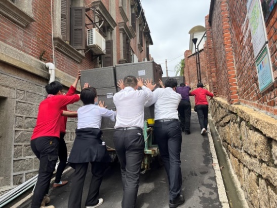 饭菜从码头到学校还有很长一段距离,那段距离全靠人力板车运输。鼓浪屿海拔并不高,但岛上有很多陡坡,从码头到学校的途中就有很长的一段,单靠车夫一人拉不上去,此时就需要党员与志愿者们在板车后面帮忙推车。