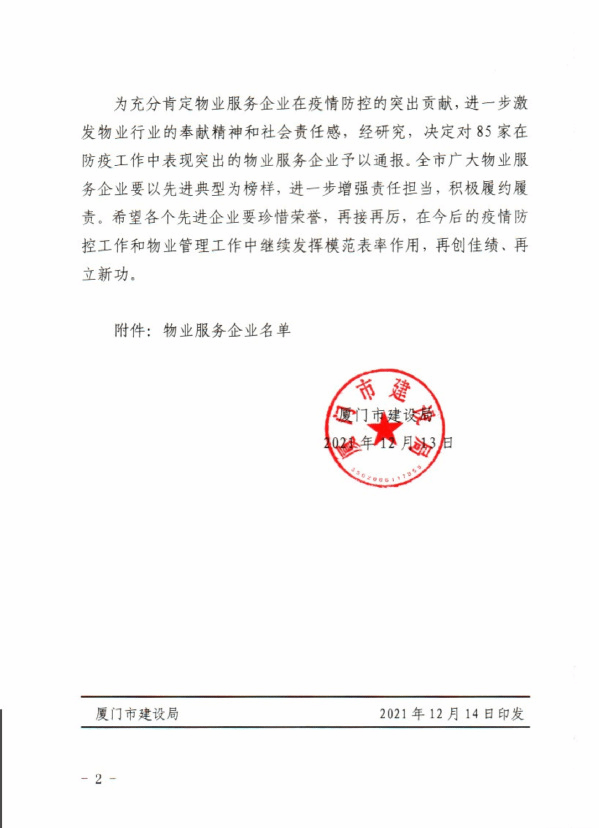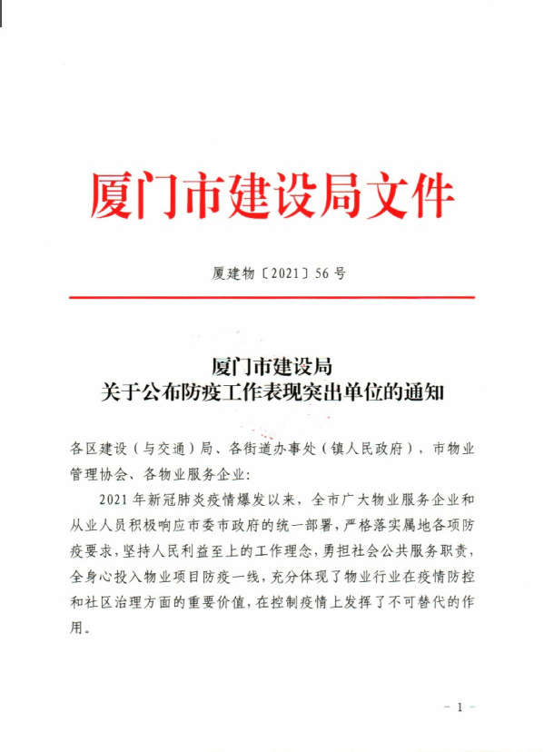 昨日,厦门市建设局发布厦建物〔2021〕56号《关于公布防疫工作表现突出单位的通知》,对2021年全市在新冠肺炎疫情防控工作中表现突出的85家物业服务企业予以通报,厦门南强物业服务有限公司位列其中。