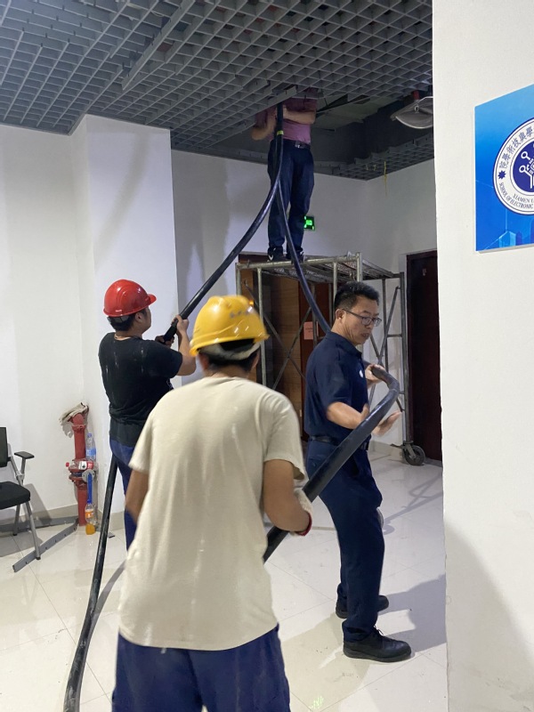 10月28日一大早,翔安校区电子科学与技术学院院办大楼一楼走廊天花板上用电增容施工现场,水电维修师傅们正在紧张施工,全力保障学院师生教学实验用电需求。据悉,电子科学与技术学院暑假前搬迁到翔安校区后部分实验室用电需求较大,急需增容。为保障新学期学院教学任务的正常开展,水电服务中心领导高度重视,积极响应、科学安排,本着“学习党史见行动,我为师生办实事”的服务初心,发挥中心一盘棋作用,统筹协调各部门施工力量,经过多次协调会商,先行启用临时供电,以翔安校区水电管理部为主力,同时紧急抽调思明校区维修部两个班组前来支援,抢抓施工期,以最短耗时完成桥架电缆安装布设。