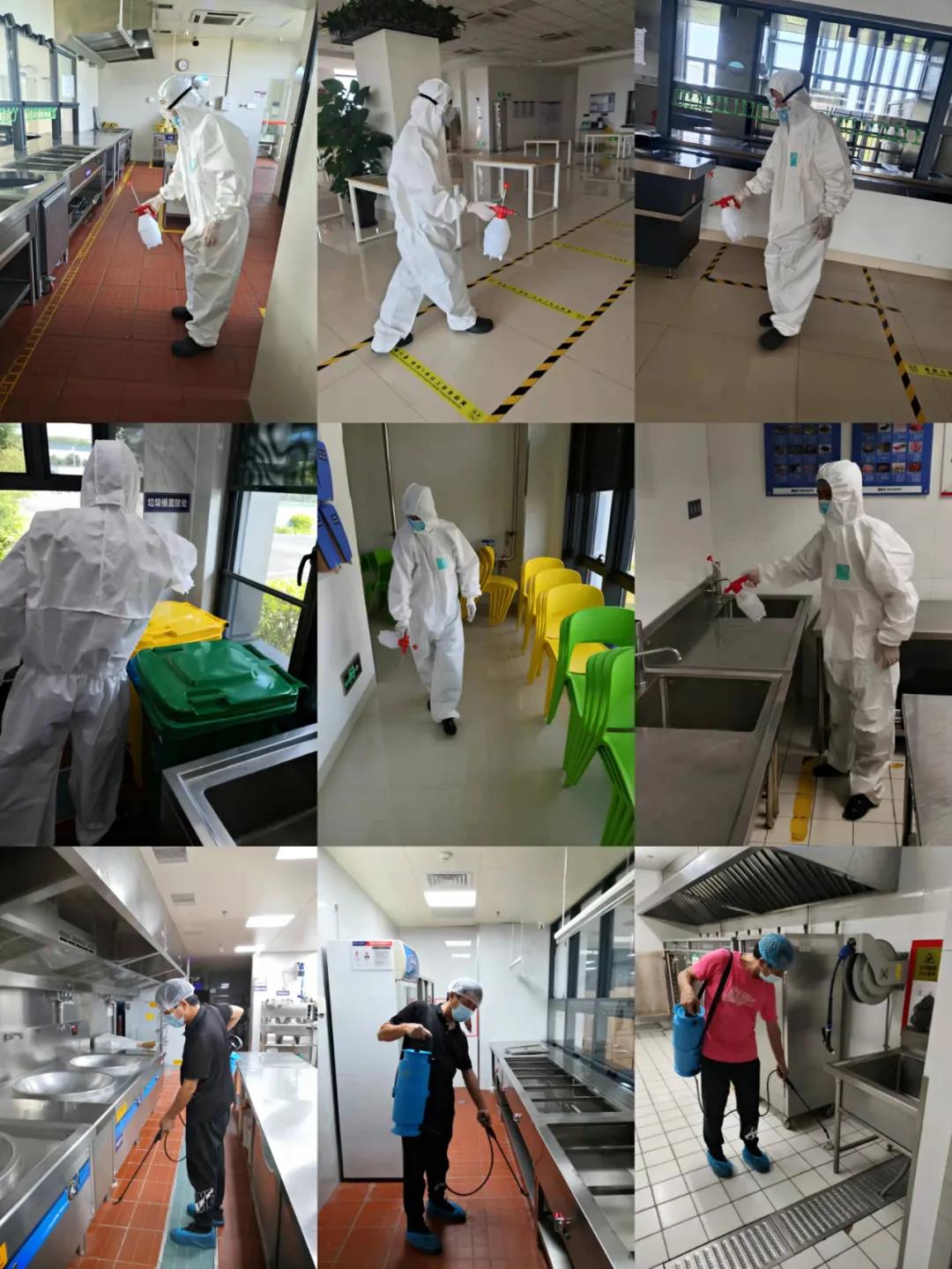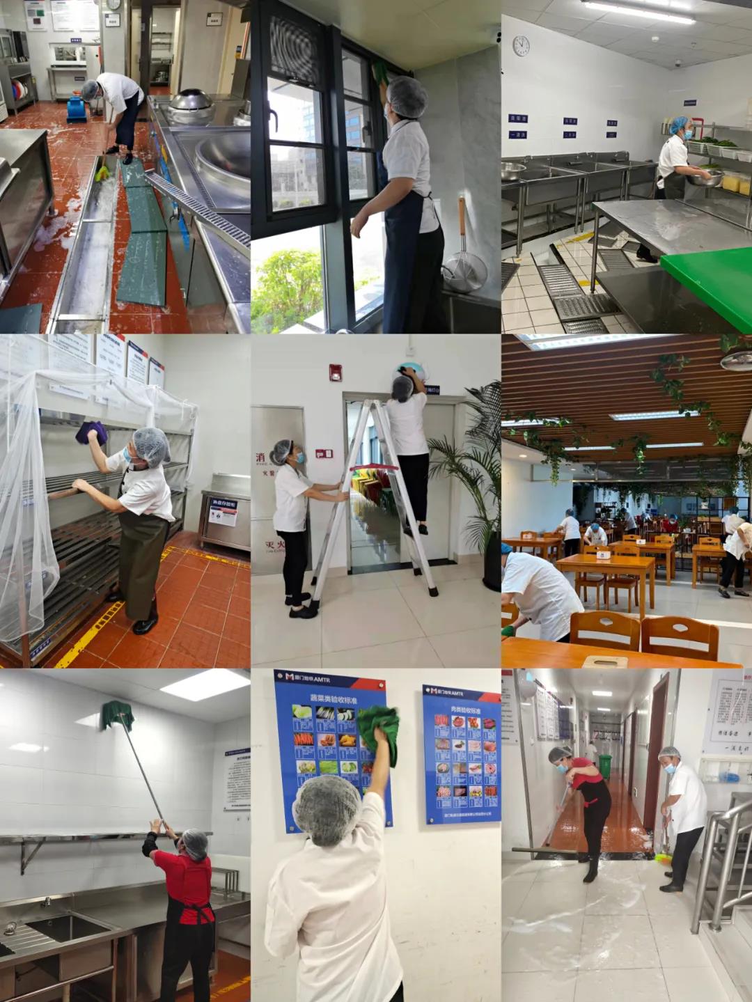 国庆假期前,各餐厅组织全体员工对食堂环境卫生进行全面和细致的大扫除、大清洗,并加强消杀、消毒力度;根据公司和甲方的要求,餐厅还对员工宿舍的环境卫生和安全隐患进行了大排查,尽力规避员工住宿的安全问题,为员工创造安全、整洁的居住环境。