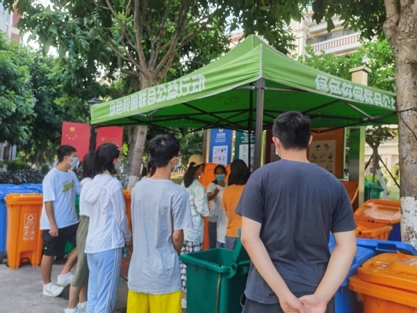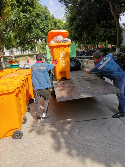 部门第一时间成立垃圾分类清运工作小组,公环中心副主任兼校区服务办副主任郑剑培任组长,统筹指挥整体工作,及时与市政沟通校区垃圾清运工作变化,商定此间垃圾清运工作事宜;根据各园区学生入住人数统筹调配各垃圾点人手,并抽调10名绿化员工、8名道路保洁增援宿舍垃圾分类督导及宿舍园区消杀工作;重新规划各垃圾点垃圾桶数量及摆放位置,增加低值可回收和厨余垃圾桶个数,并借用各餐厅及道路组40个厨余垃圾桶以作增补;对垃圾分类督导人员及学生志愿者进行现场岗前培训,加强对垃圾分类的宣传教育,督促学生养成自觉垃圾分类习惯。