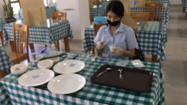 厦门市新冠疫情指挥部11号令之后,各食堂全面取消堂食。食堂设置单向出入口,每日三次进行消毒,洗手处均备足洗手液与消毒凝胶。同时,全面清理内部及周边环境卫生,做好水池、垃圾桶等基础设施的清扫保洁和消毒。严格垃圾分类,及时密闭垃圾,做好废弃一次性口罩的集中收集与处置。对冷冻库进行检查,不留死角。工作流程上,生熟食材分开存放,食物烧熟煮透,处理食物的案板、菜刀、盛具做到生熟分开并及时彻底清洗,处理生鱼海鲜生肉后立即洗手。