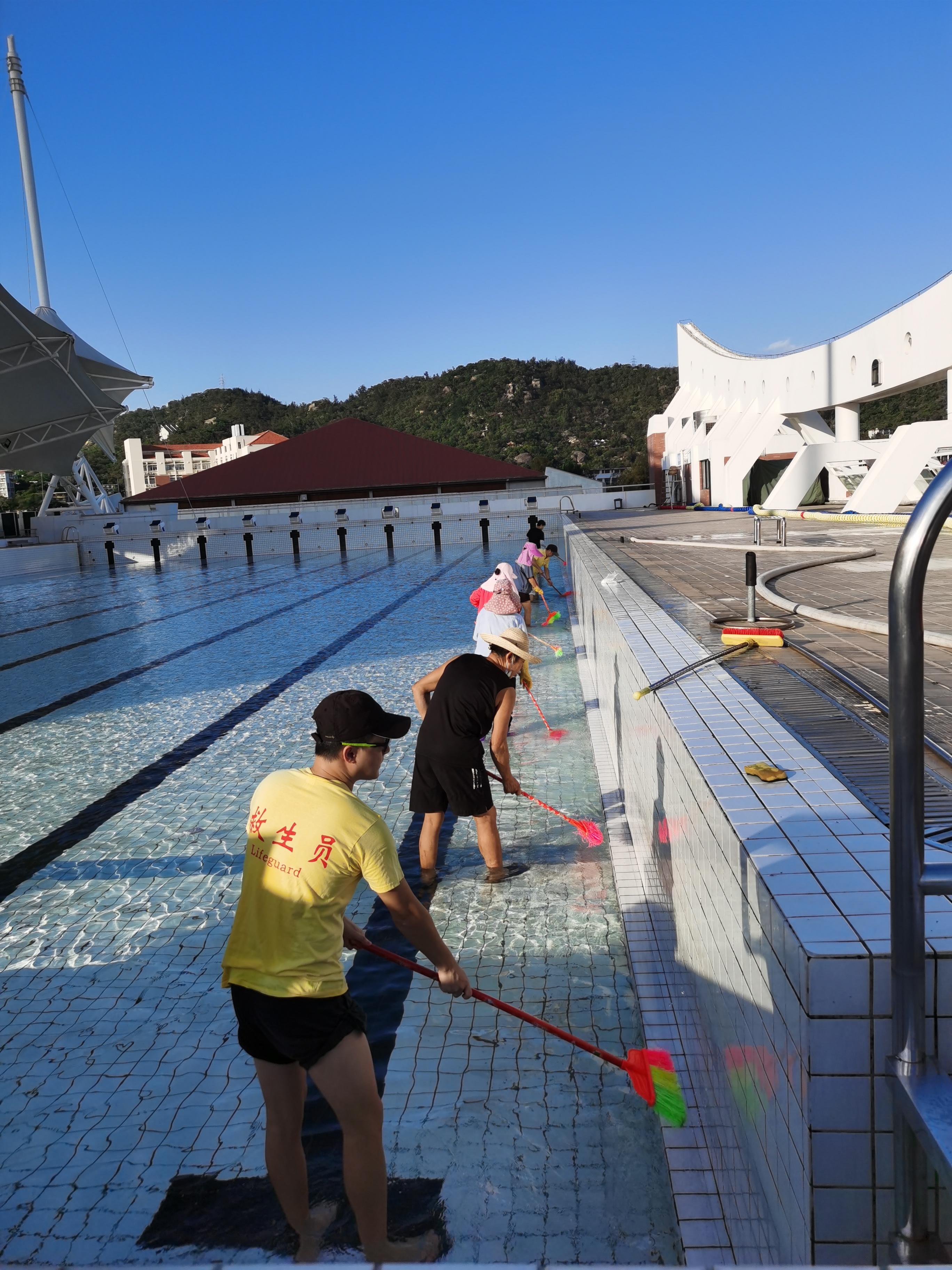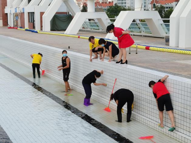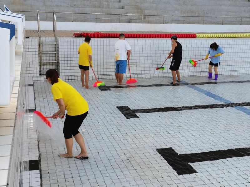 游泳馆暂停开放期间,泳池内仅保留较低的水位,池底吸附了水垢、粉尘等杂质。为此,中心公共教学服务部组织员工对泳池进行全面刷洗,重新更换泳池水,并对机房水处理设备进行清洗、检修。还对游泳馆淋浴间、更衣室、卫生间等进行清洗、对游泳馆周边环境进行清理,落实全方位的防疫消杀。