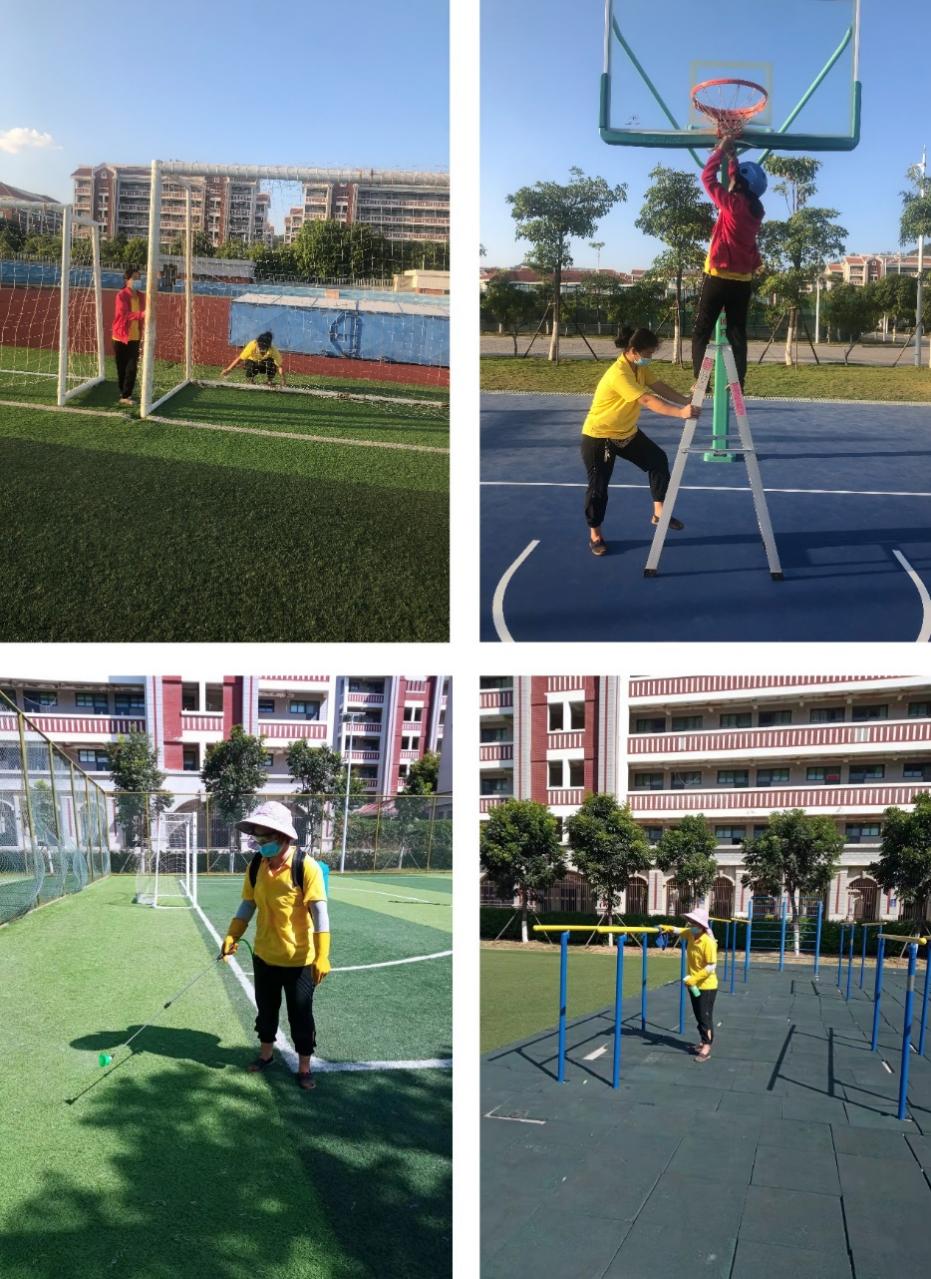 室外运动场撤除了外围布置的警戒线、球类暂存桶和疫情管控通告牌,并解绑了篮球网与足球网,重新恢复使用。为保障场地环境卫生安全,还扩大了运动场所的消杀与保洁范围,加强户外运动器械的擦拭等。