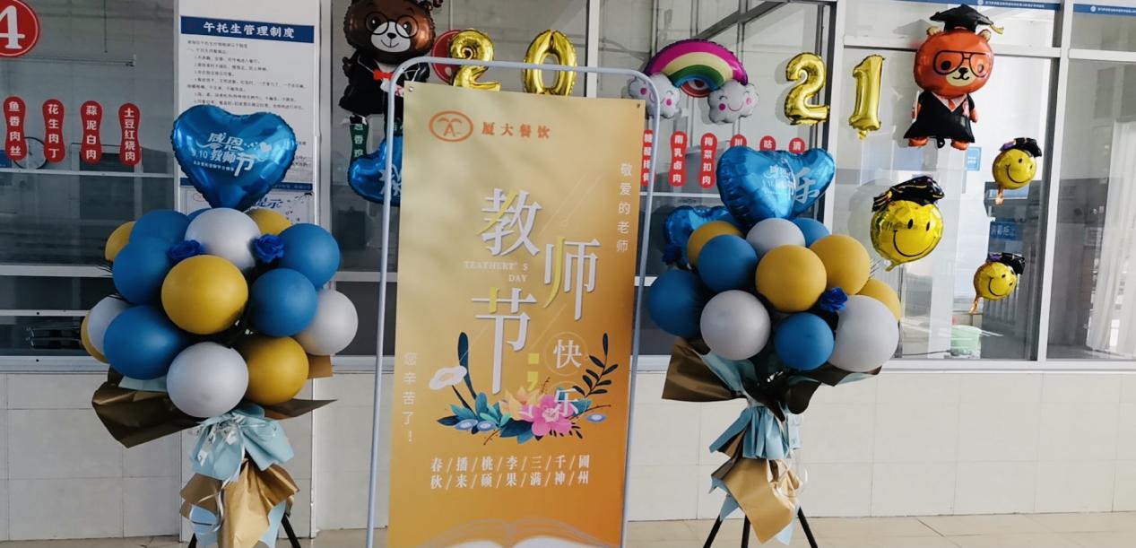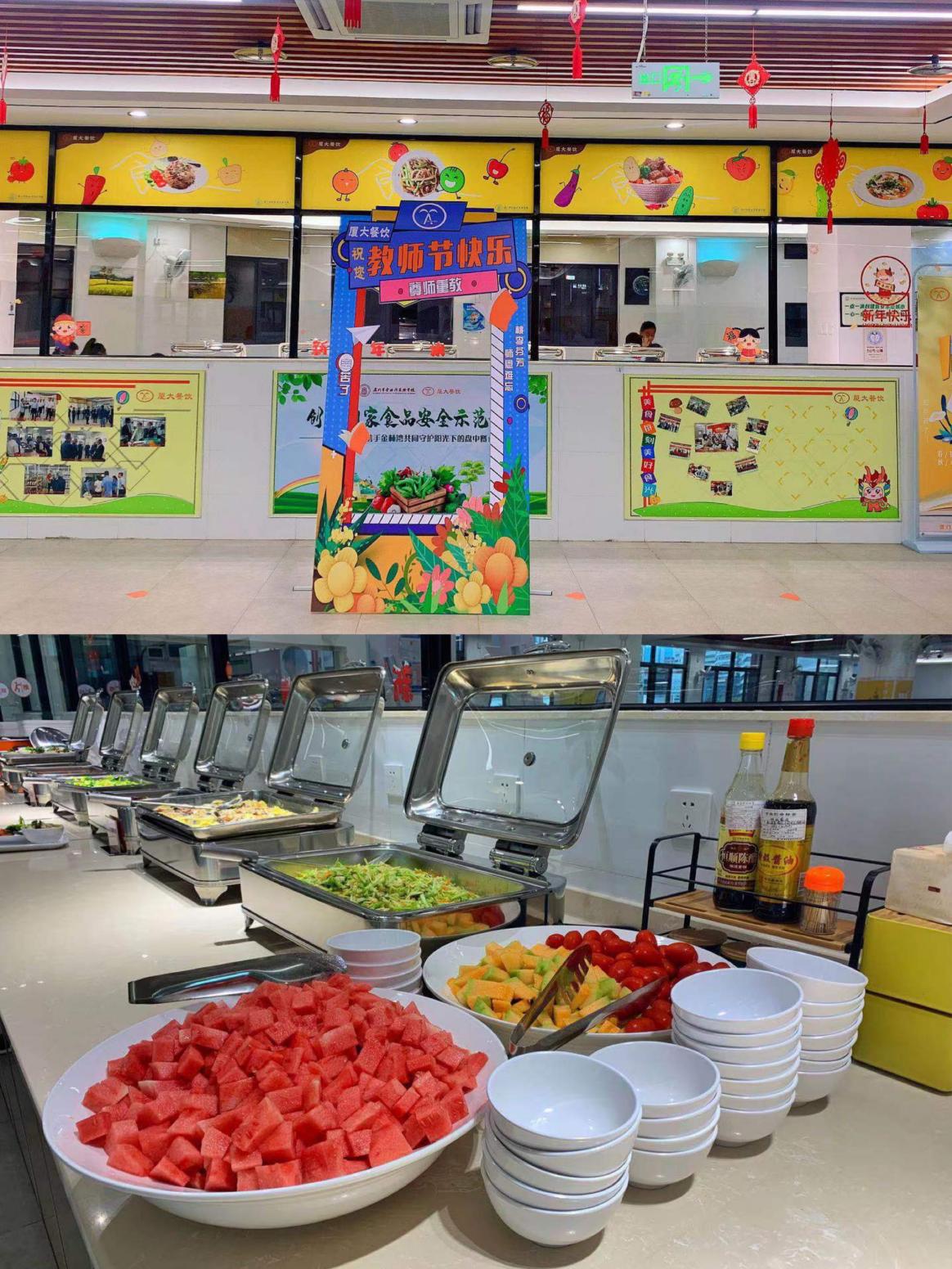 公司文宣小组、菜品研发小组与各餐厅提前筹备,文宣小组为教师节互动氛围布置统一设计并订制打卡画框与祝福展架;菜品研发小组携手各学校餐厅精心策划营养菜单,为老师们提供新鲜美味的自助餐、节日蛋糕、酸奶水果等,大家欢声笑语,共聚一堂。