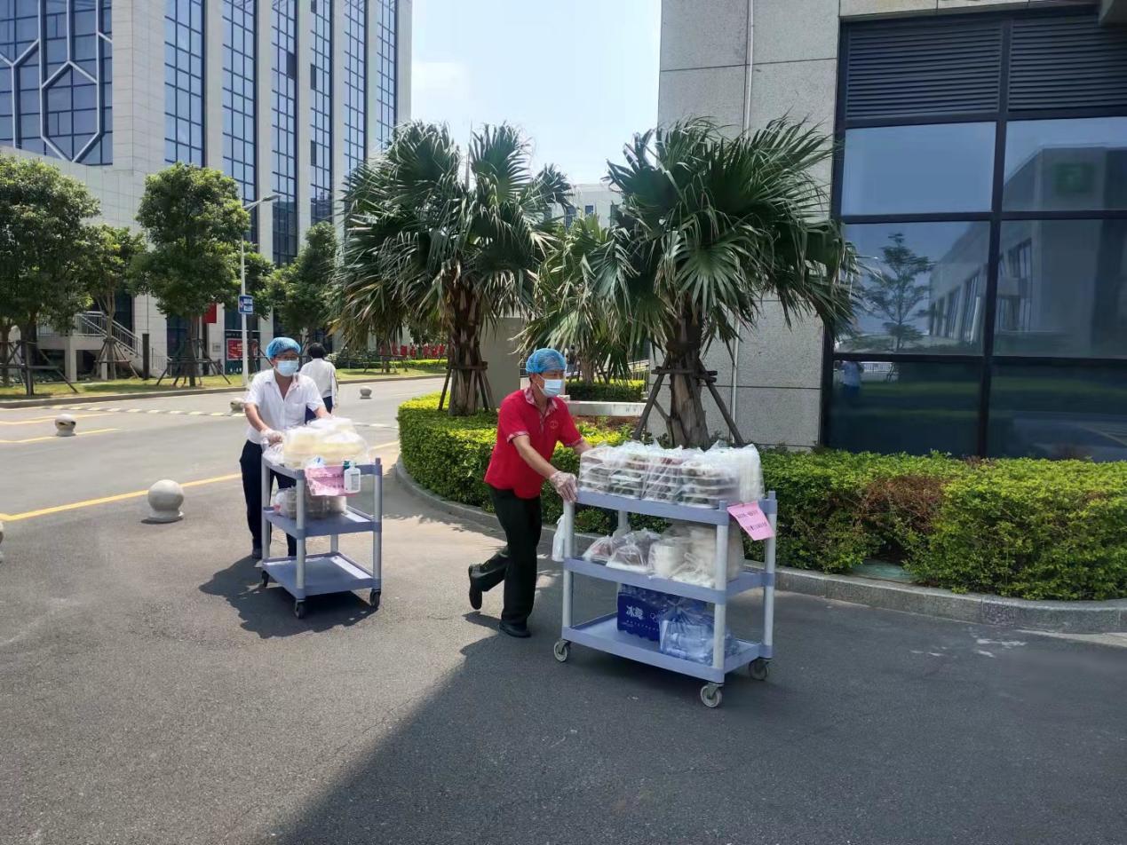 “厦大餐饮”人全力为第一医院、疾控中心、翔安医院、同安第三医院的医务人员做好餐饮后勤保障工作,也为入驻同安区的实验中学的医护人员及厦门金湖社区、禾盛社区等多个核酸检测点的医务人员、社区志愿工作者提供营养套餐、水果、矿泉水、可乐。“厦大餐饮”人与医务人员共同努力、齐心抗疫,哪里有需要,就到哪里去,守护在抗疫工作者的身后,展现了应有的抗“疫”姿态和社会责任感。