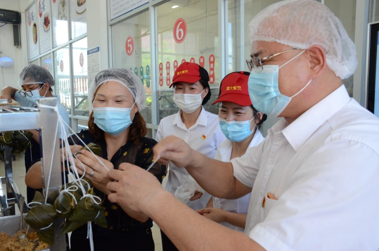 6月14日端午节当天,厦门医学院厦大餐厅与学校共同组织“我为师生办实事系列活动。”餐厅员工在端午节前,加班加点制作近7000个粽子,为每一位在校师生送上端午礼包,400多名学生在餐厅阿姨的帮助下体验了包粽子活动,并从中挑选了500个粽子送至集美区爱欣老人公寓。
