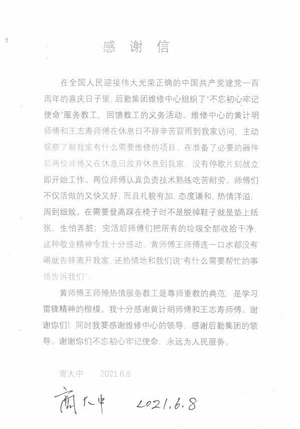 水电维修部主动联系嘉庚学院退休教职工,预约时间上门排查住家水电设施、询问需要维修的设备,检查线路排查隐患、维修灯具、更换插座、更换排气扇、安装风暖等,为退休教职工提供贴心暖心服务,帮教职工解决日常生活中存在的困难问题,得到嘉庚学院老师的高度赞扬与肯定。