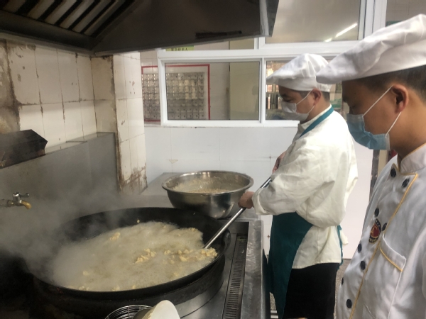 供餐筹备过程中,附中餐厅鼓舞员工士气、开展技能培训,强化食安意识,细化责任分工,全员积极配合餐厅推进高考供餐工作开展。为保证菜肴口味,中心行政总厨江显清带领附中餐厅厨师团队进行反复试菜和优化;为确保食品卫生安全,中心化验室检测人员多次到餐厅对食材、餐具进行检测,确保安全无虞。
