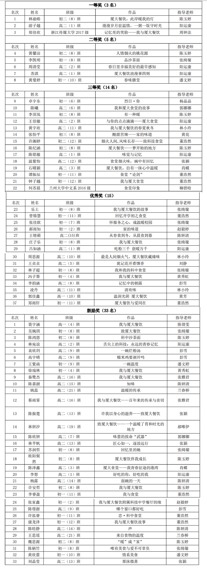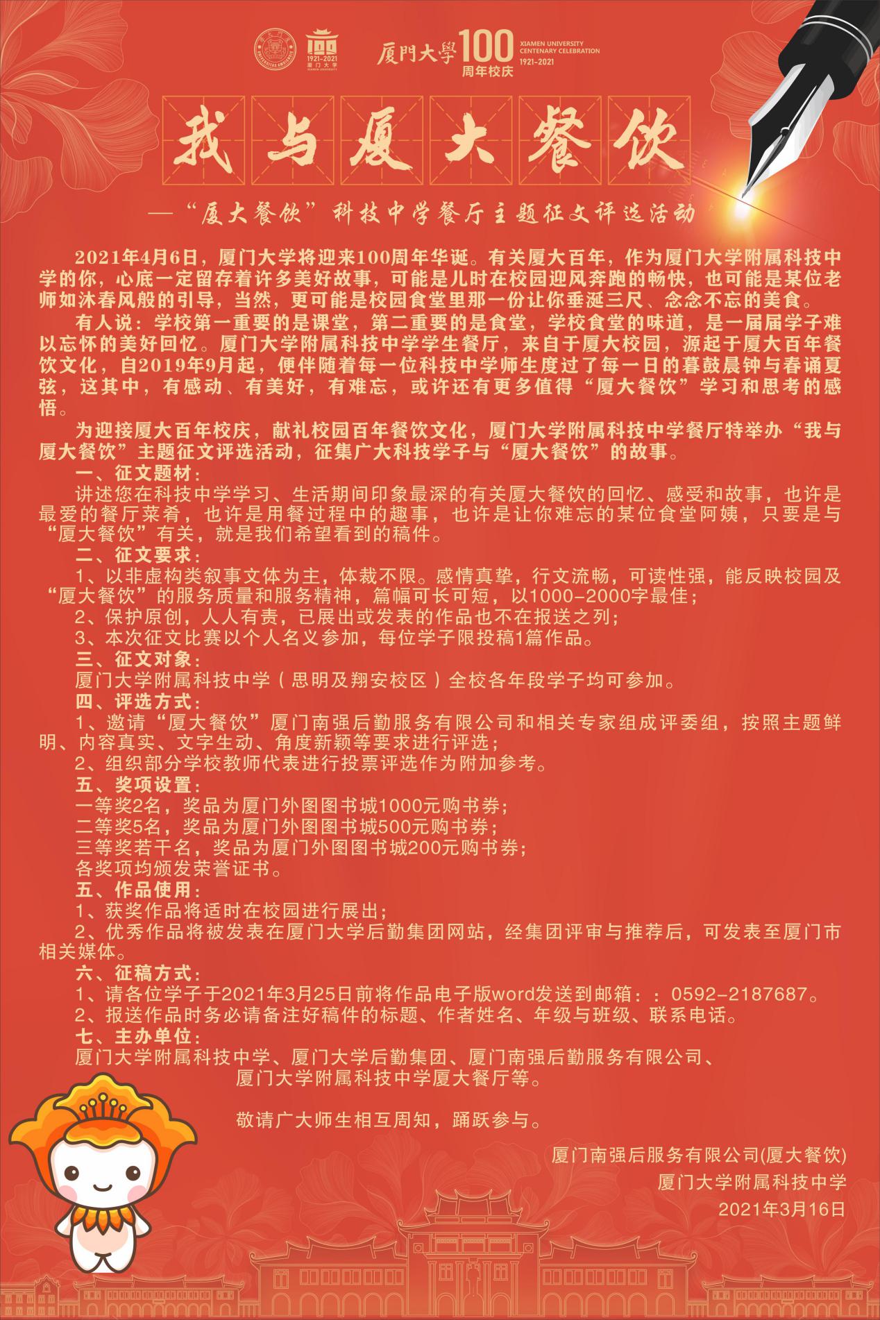 为迎接厦门大学百年华诞,弘扬厦大校园饮食文化,彰显“厦大餐饮”用心做菜,用爱服务的理念,厦门南强后勤服务有限公司于2021年3月在厦门大学附属科技中学餐厅特举办“我与厦大餐饮”主题征文评选活动,征集广大科技学子与厦大餐饮的故事。