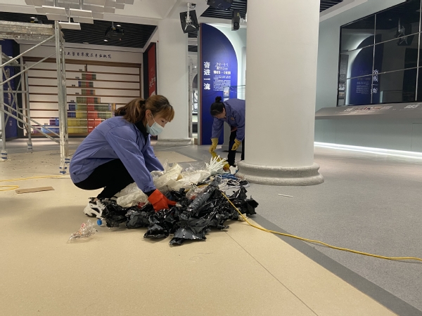 2020年8月,各展厅开始了拆装、施工。众多校外施工人员进入现场,成堆的布展材料码放在周围,半年多的施工期,都为校史馆的维序和保洁工作带来巨大挑战。项目组不分年节、加班加点坚守在岗位上,保障了校史馆施工期间安全有序、清洁卫生。