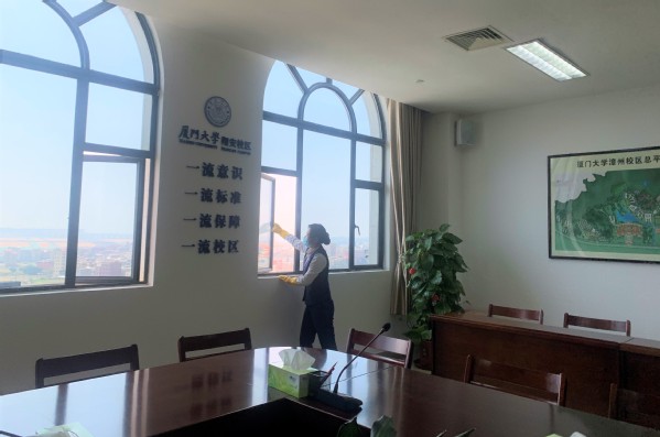 保洁组:3月26日前全体保洁员开展了第一次整体大扫除,清洗了各楼宇地板、公共区域窗帘、中庭,完成卫生间环境整治。3月31日前完成了第二次卫生细节清理,包括除尘、门窗擦拭、雨水管、排水沟、下水道清理和完善垃圾桶布置,完成了各楼宇外墙清洗工作。一切的努力都是为了将厦大最美的样子展示给师生和来宾。