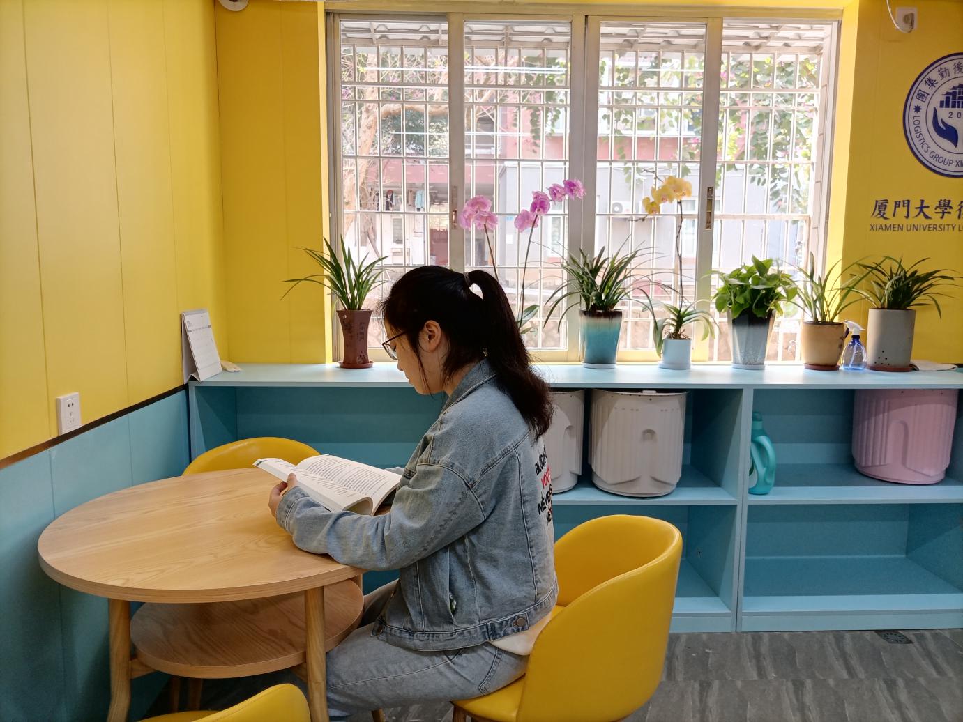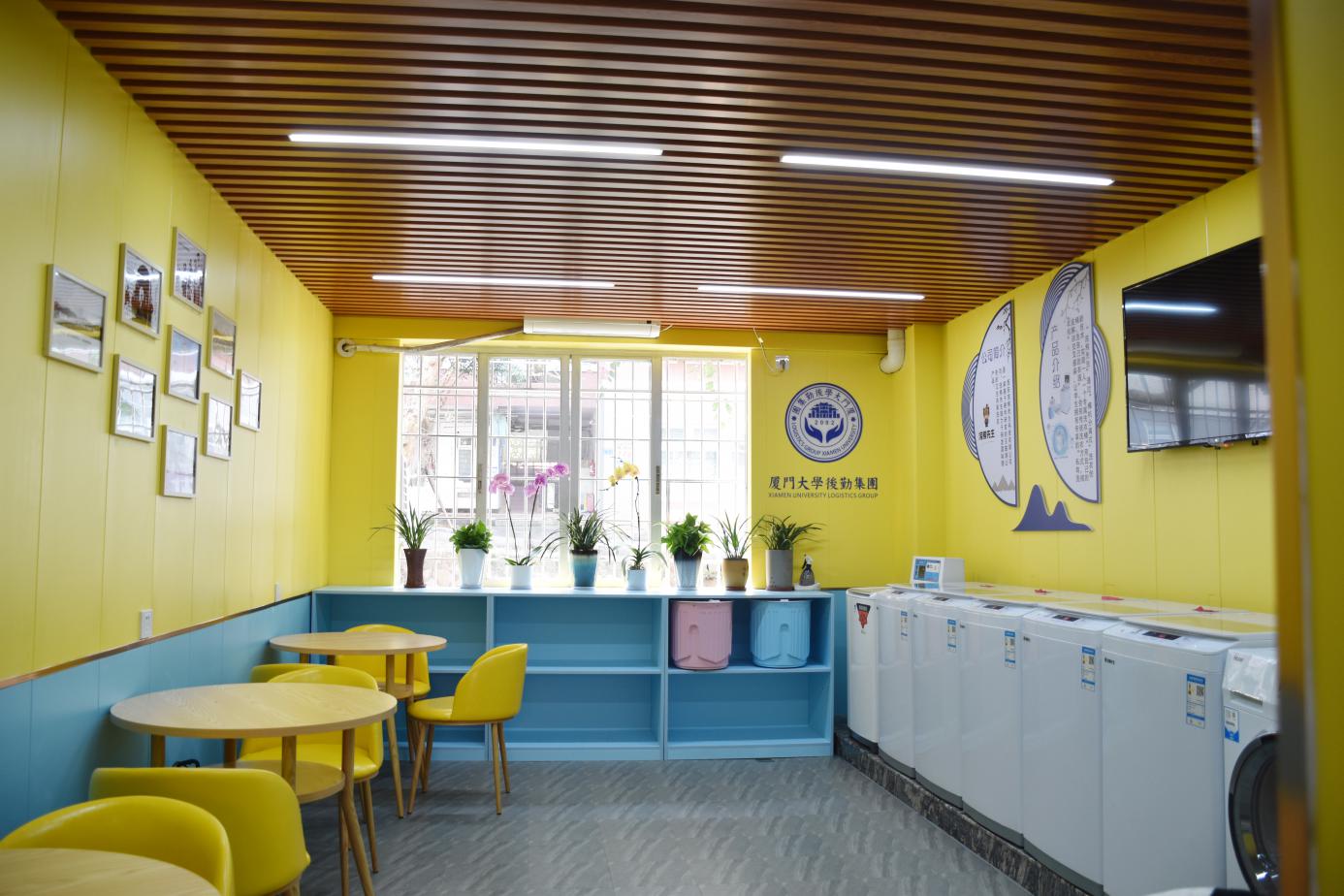 一进入芙蓉六109,清新舒适感扑面而来:暖黄色的墙壁和桌椅,蓝色的柜子,还有排列整齐的洗衣机、烘干机、洗鞋机。墙上悬挂的厦大风景画,窗户边盛放的蝴蝶兰、绿意盎然的盆栽,更是给整个房间增添了人文气息。