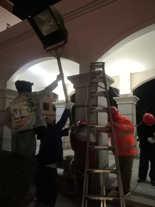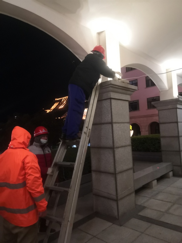 12月30日,嘉庚广场跨年舞会通道口安装临时照明灯及电源线路布设。