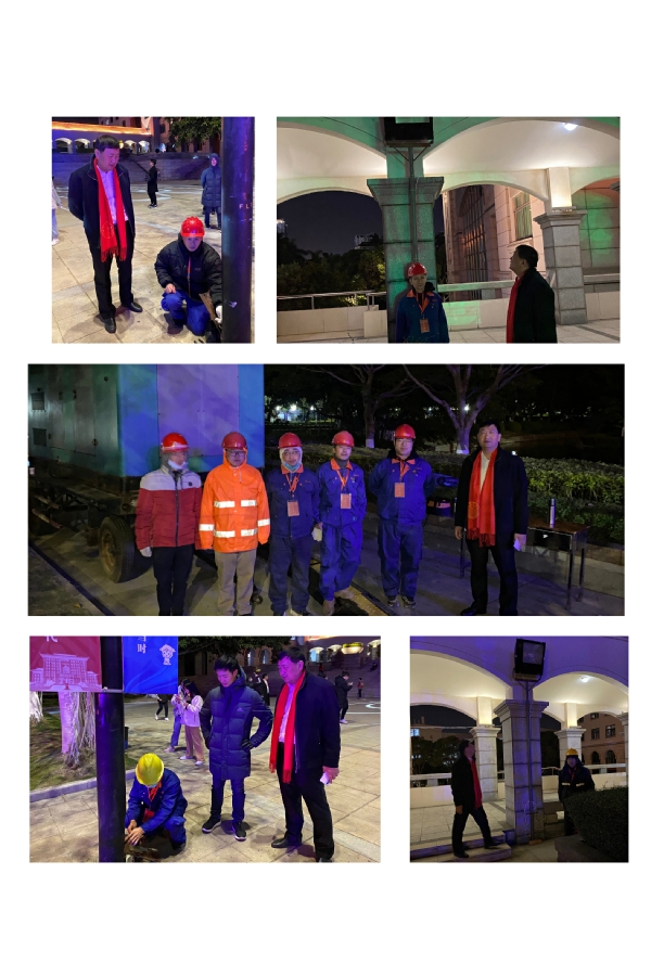 学校资产与后勤事务管理处副处长骆宏、集团副总经理王裕民到场查看保障情况,并叮嘱水电维修师傅在做好晚会供电安全保障值班工作的同时也要注意个人防寒工作。