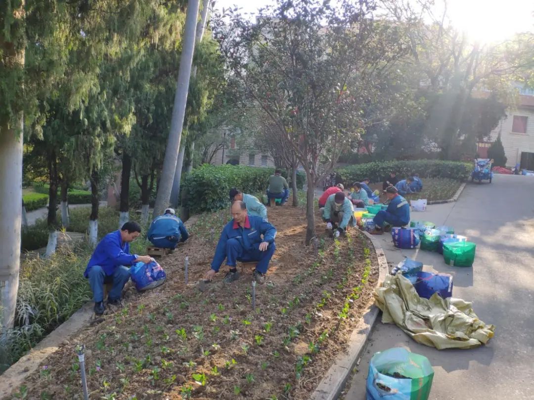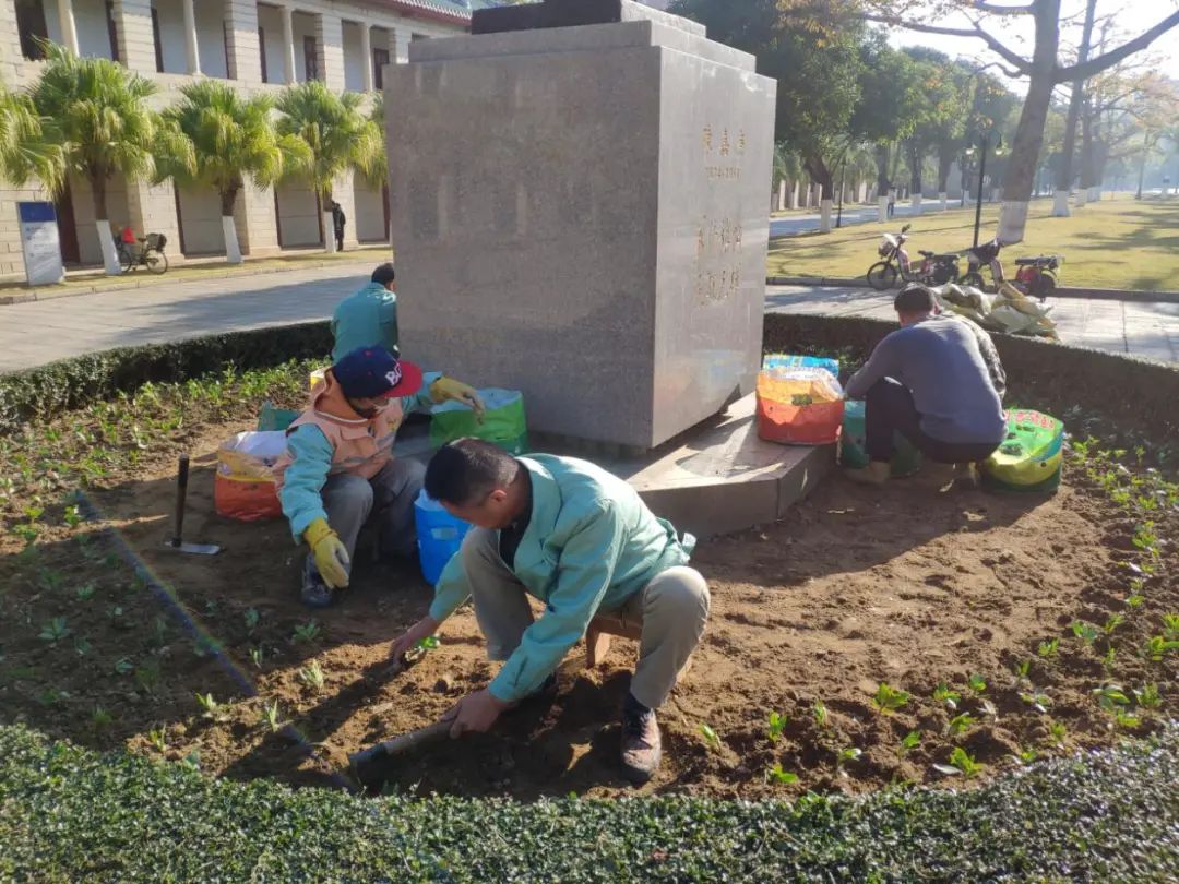 此外,绿化员工在忙碌着提升校园环境,以迎接即将到来的百年校庆;安防员也趁着假期加强队列训练和防暴恐演练,提升安全防范能力,确保校园安全稳定。