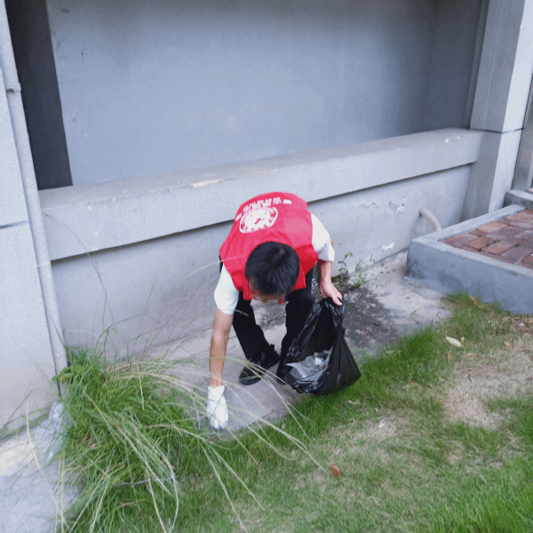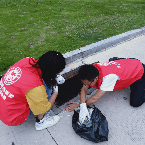 上午8点,参加活动的志愿者们身着红色志愿者马甲,拎着垃圾袋等工具,仔细认真地捡拾地面垃圾。不论是深入灌木丛的饮料瓶,还是散落在污水井盖下的小烟头,志愿者们都一一弯腰捡起,细心地从缝隙中抠出,不放过任何一片区域、任意一处死角。