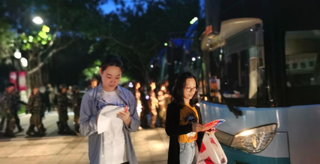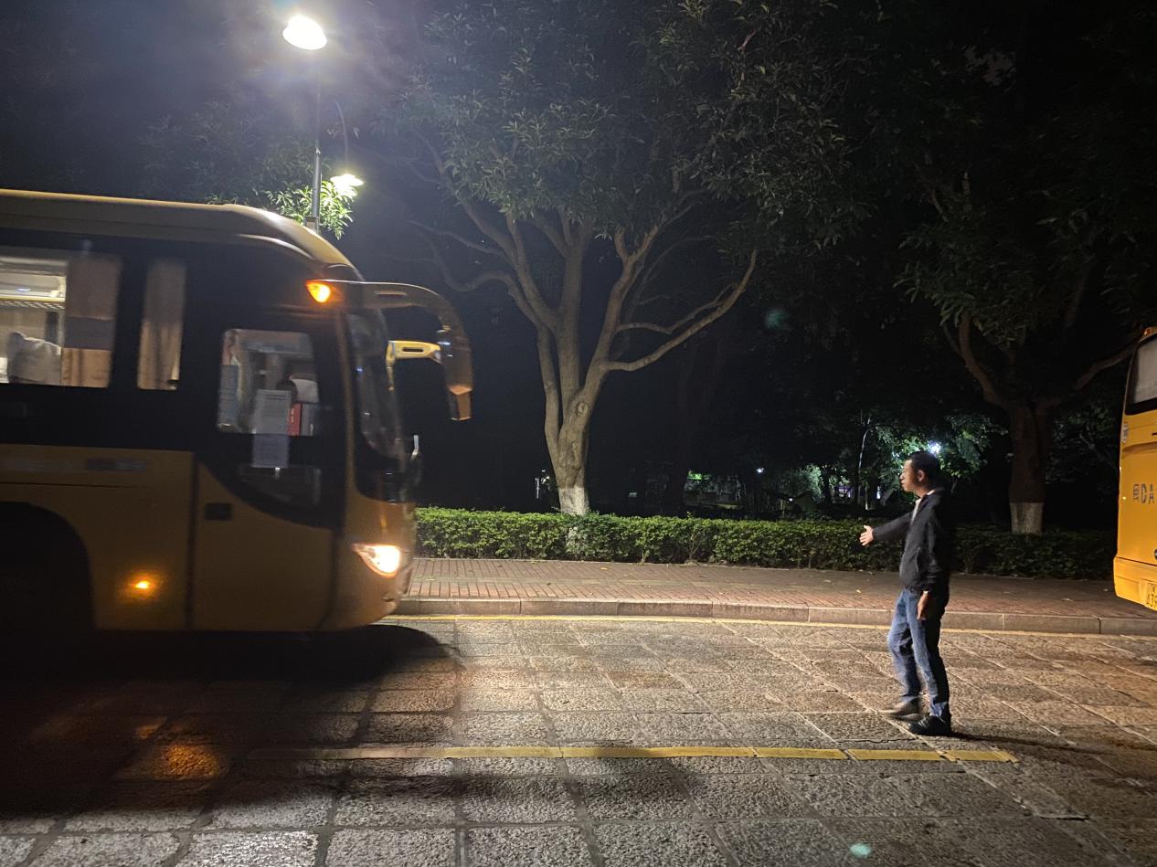 嘉庚广场,工作人员贴车标,以便学生按号乘车