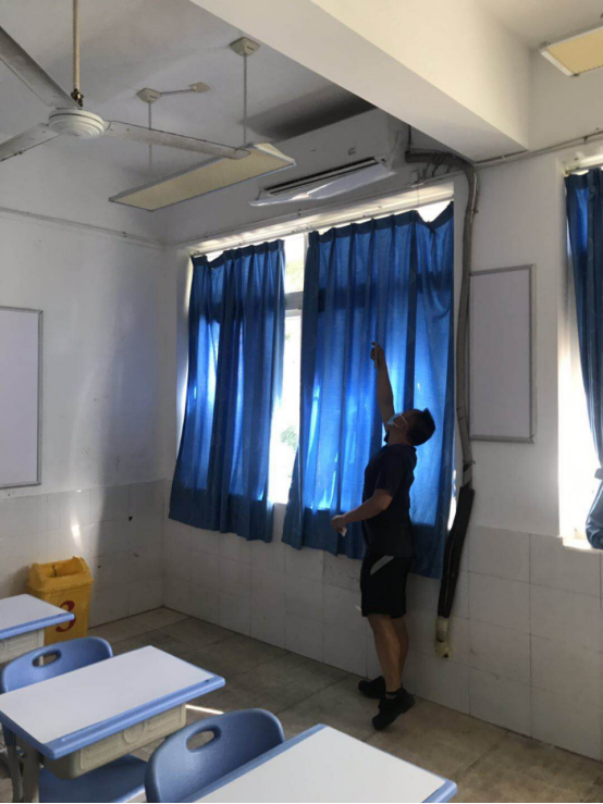 “考题三”:七月酷暑难耐,如何保障考生清凉应试?全方位、多手段。从考生进校开始,即可在校门处搭建好的遮阳棚内享受阴凉;入校后,可以在专门开辟的空闲教室内休息,等待开考;为确保开考时教室内温度适宜,南强物业工作人员提前开启考场空调降温。开考前夕,维修员已将所有考场内的空调都被一一拆卸下来深度清洗,消毒好,并进行运行测试,确保每一台空调都正常工作。此外,为避免冷风直吹,还专门为每台空调安装挡风板。