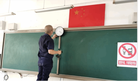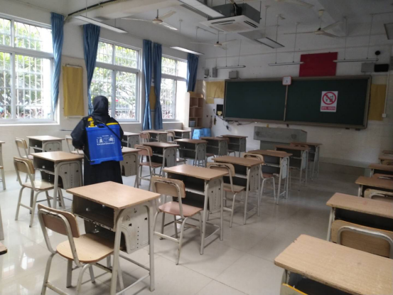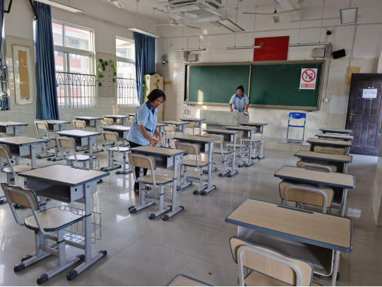 “考题二”:在布置标准化考场方面做了哪些工作?提前谋划,有序开展。在时间紧、桌椅搬运量大的情况下,掌握好预先被划分为考场的教室内师生离场时间,随后立即着手开始布置,清出所有教室里的所有课本、资料,擦除桌面上、桌斗里的字迹,黑板、宣传栏均用厚布或纸张覆盖,确保室内四周六面整洁干净无字。调配其他非考场教室内桌椅,按照每间考场60张课桌、30张座椅的标准整齐摆放,放置提前擦洗好的30张考试用垫板,悬挂调试好的时钟。