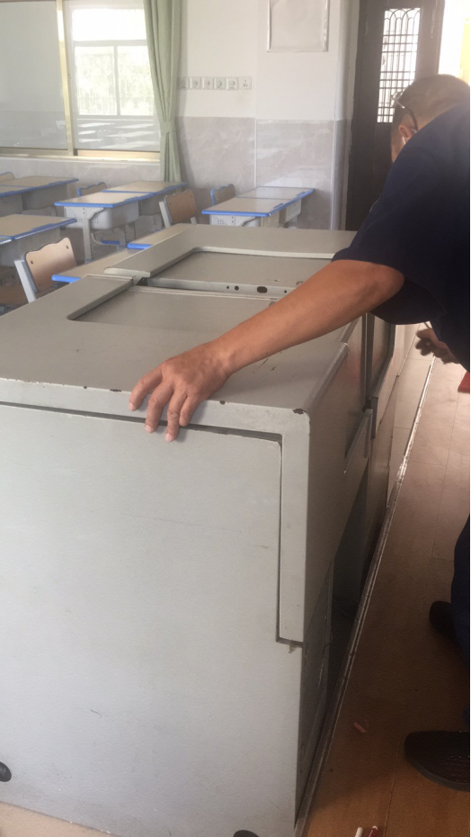 厦门外国语学校初中部项目维修员正在维修考场内讲台