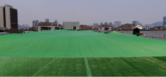 厦门外国语学校初中部项目员工正在楼顶铺设遮阳网