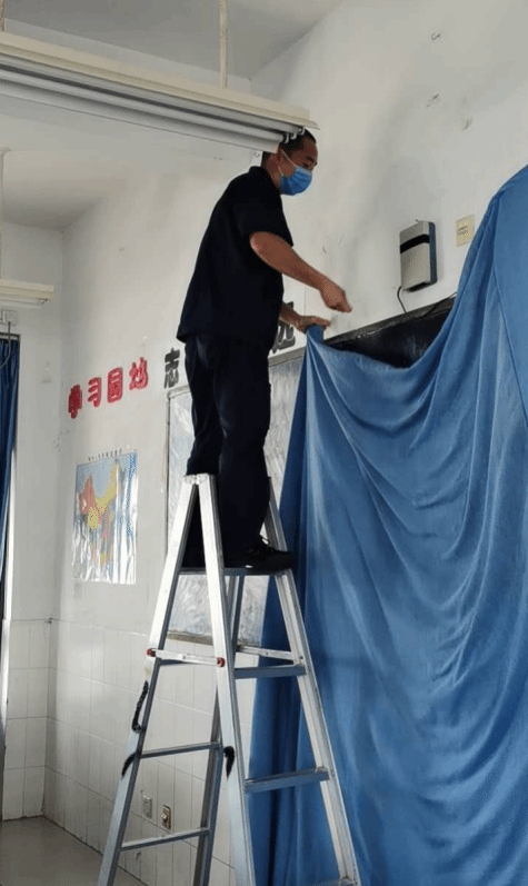 厦门双十中学枋湖校区项目维修员用布遮挡黑板
