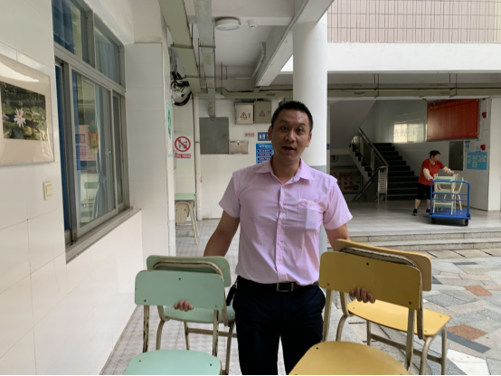 公司副总经理吕楠鑫在福建省厦门双十中学镇海校区项目帮忙搬运椅子