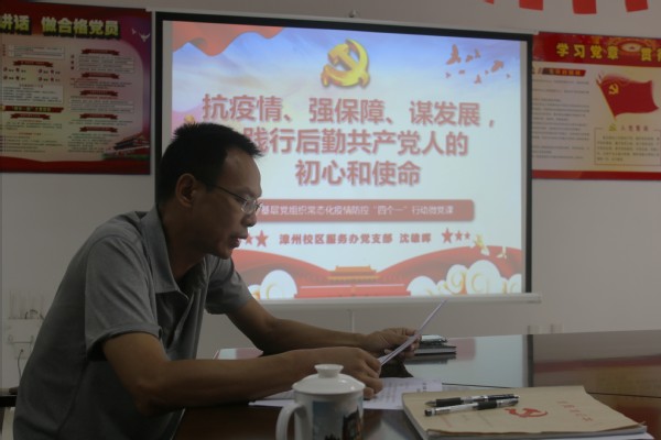 会上,漳州校区服务办党支部书记沈雄晖为与会党员讲授题为《抗疫情、强保障、谋发展,践行后勤共产党人的初心和使命》的微党课。他围绕共产党人的初心和使命,从国内、国际疫情防控形势讲起,回顾党中央和集团党委的疫情防控历程和取得的成果,讲述国内和集团疫情防控、生产自救先进典型的故事,分享自己参与疫情防控工作的心得体会,最后就下一阶段疫情防控工作常态化的相关工作进行了布置。