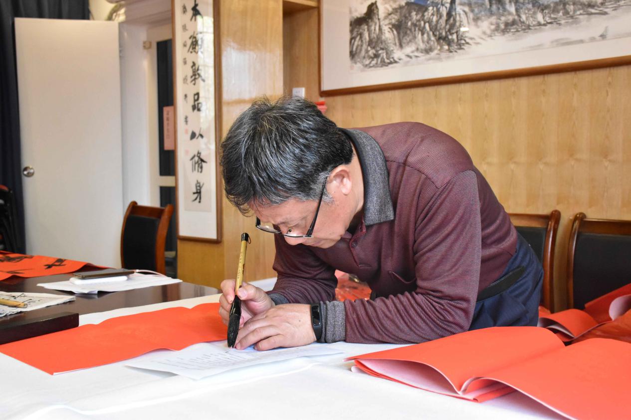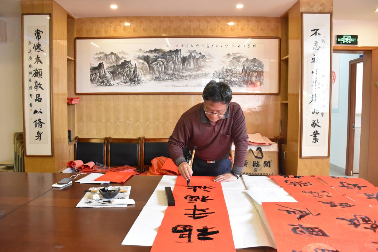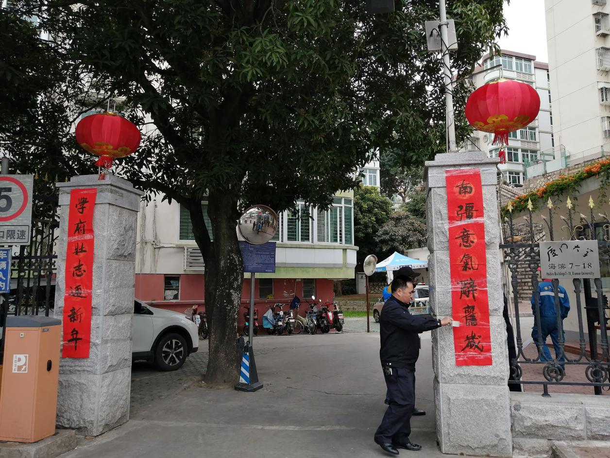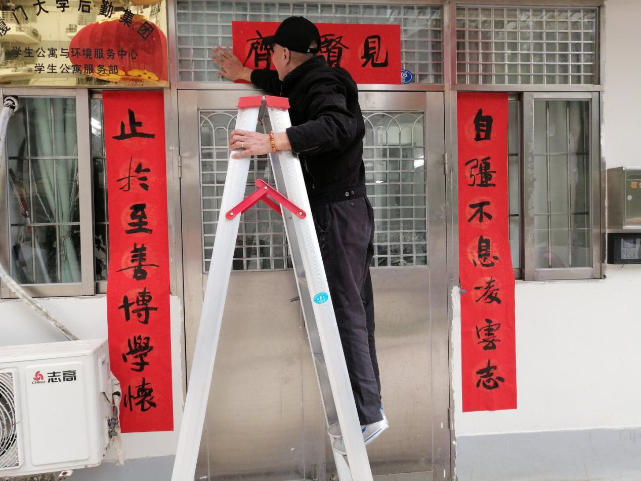 爆竹声中一岁除,春风送暖入屠苏。千门万户曈曈日,总把新桃换旧符。寒假伊始、年关将至,学生公寓与环境服务中心副主任张国强却更忙了,他除了要部署整个校园环境的除尘布新工作外,还发挥自己的爱好,多日为校园和员工书写春联,其中有几幅为他自撰,如“早出晚归美化校园融伟梦,寒来暑往安护校园守初心”、“不忘初心乐群而敬业,常怀本愿敦品以修身”、“百年学府同欢庆,四海精英共颂恩”、“自强不息凌云志,止于至善博学怀”等,用心为校园书写有特色的对联。在潇洒苍劲有力的笔锋下,一副副散发着墨香、带着满满激励与祝福的春联随之贴到了学生公寓园区、教工住宅区、办公场所等大门上。自己动手书写的春联,更富有传统年味,为校园增添了浓浓的节日气氛。