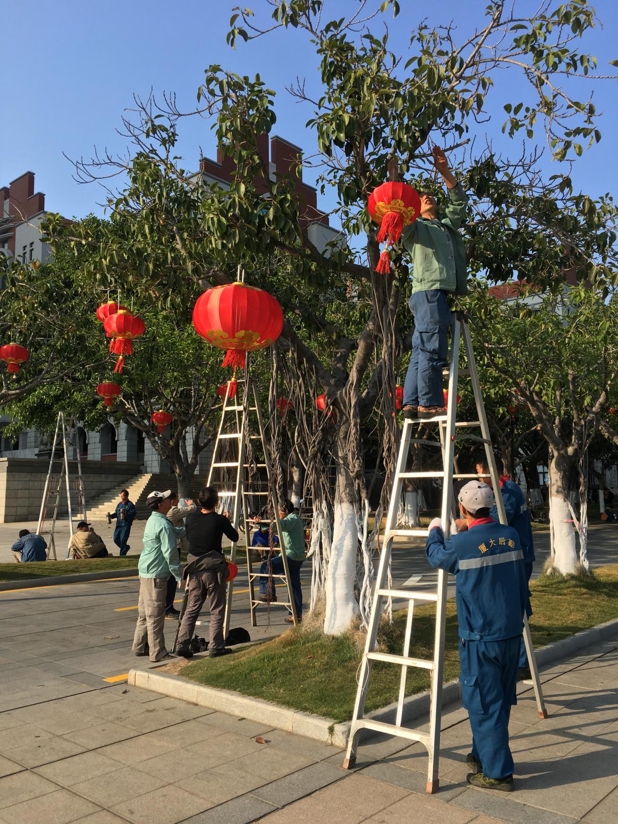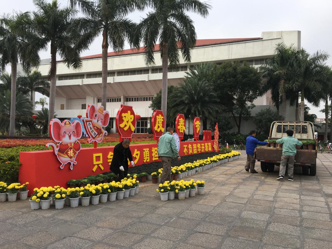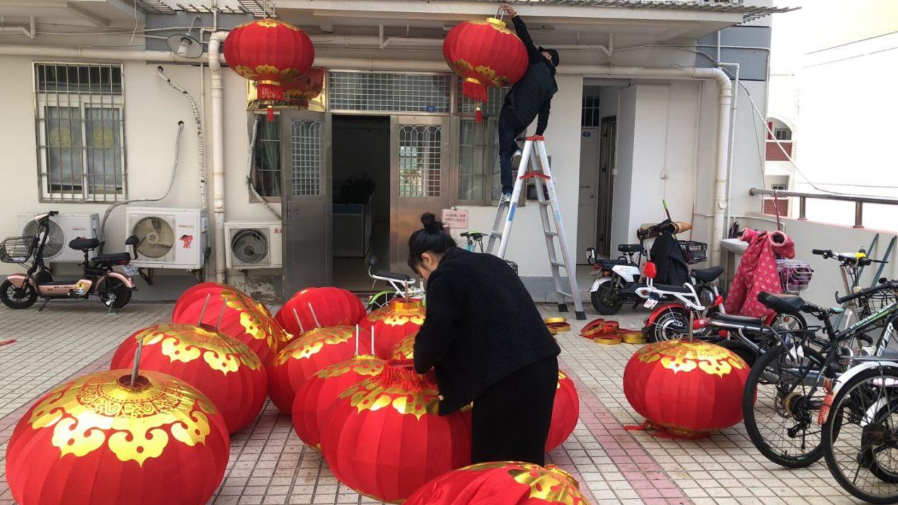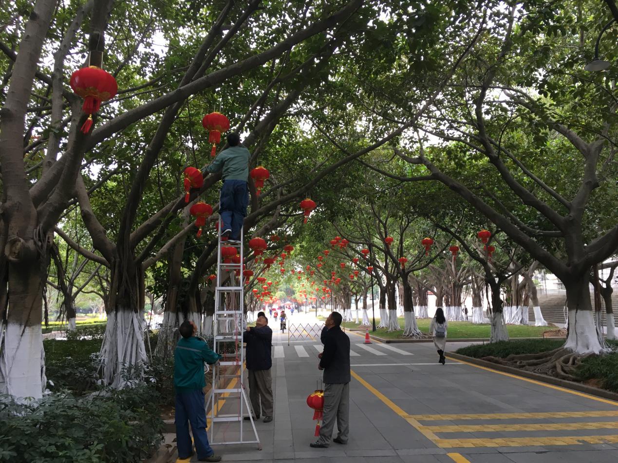 为了做好校园春节环境布置工作,学生公寓与环境服务中心各部门忙着大扫除、挂灯笼、贴出来,整个校园到处张灯结彩,洋溢着喜气洋洋的过年气氛。