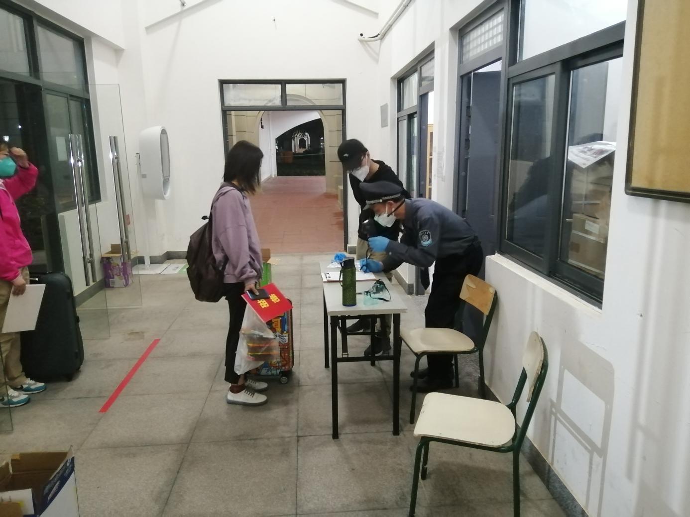 学生入园区前需进行体温检测,安防员登记入住信息