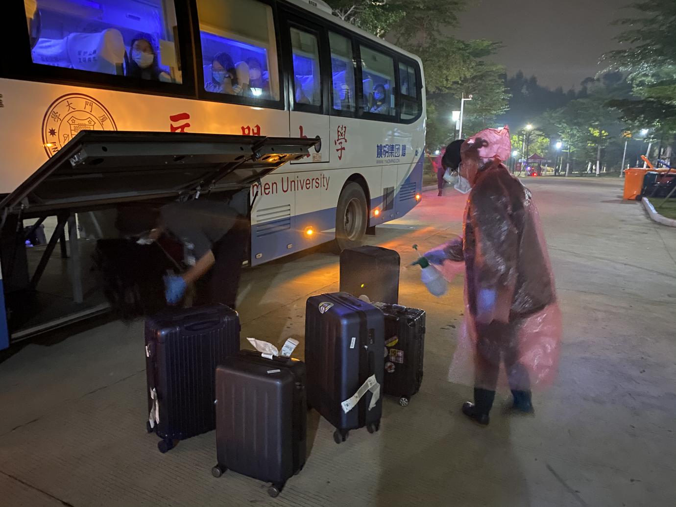 学生抵达时,工作人员立即对他们的行李箱进行消毒