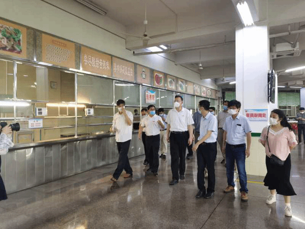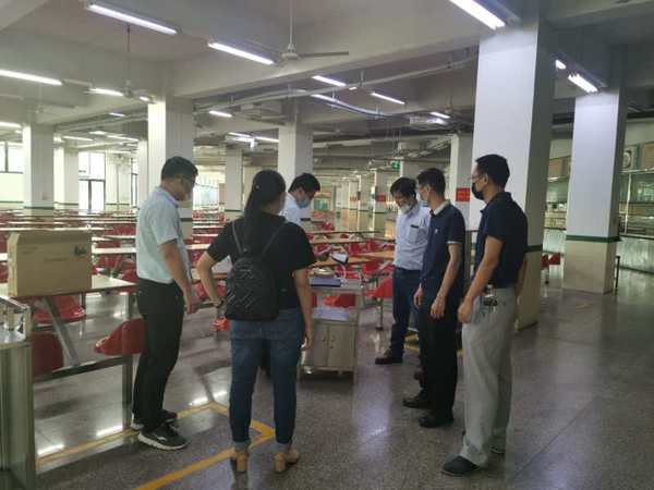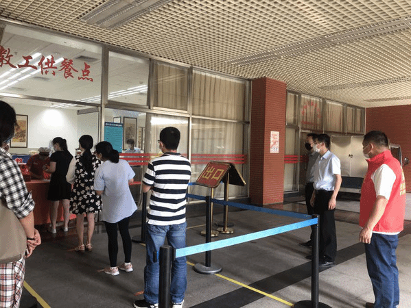 实地考察主楼教工餐厅供餐通道,布置出入口标识、一米线、温馨提示