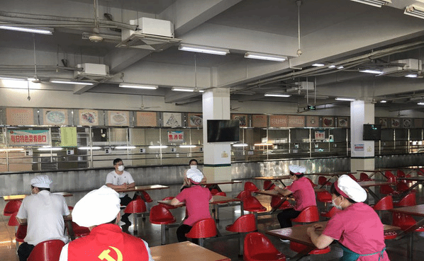 午餐供餐结束后,组织员工小结教工返校供餐工作情况