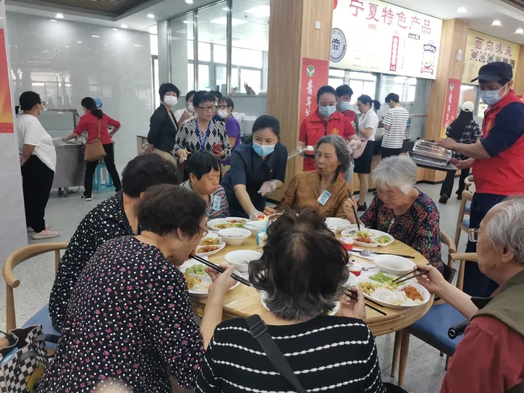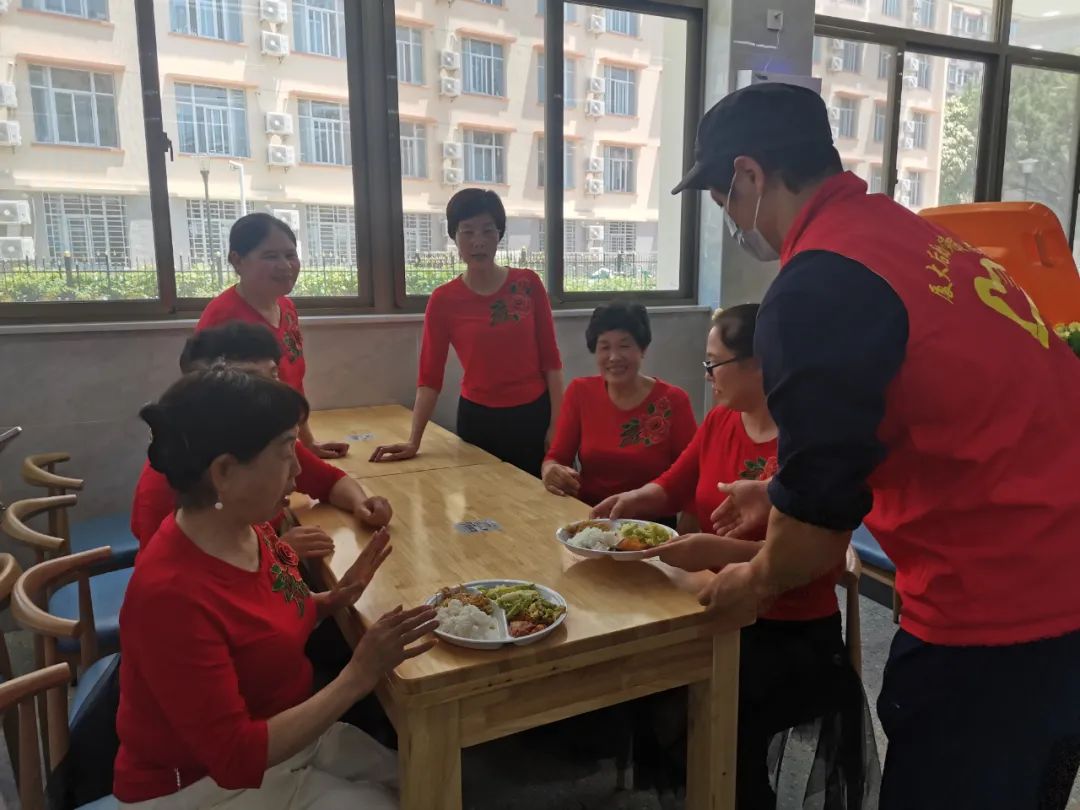 志愿者们穿梭其间,为长者们端菜盛饭,分发餐食,服务细致周到体贴。