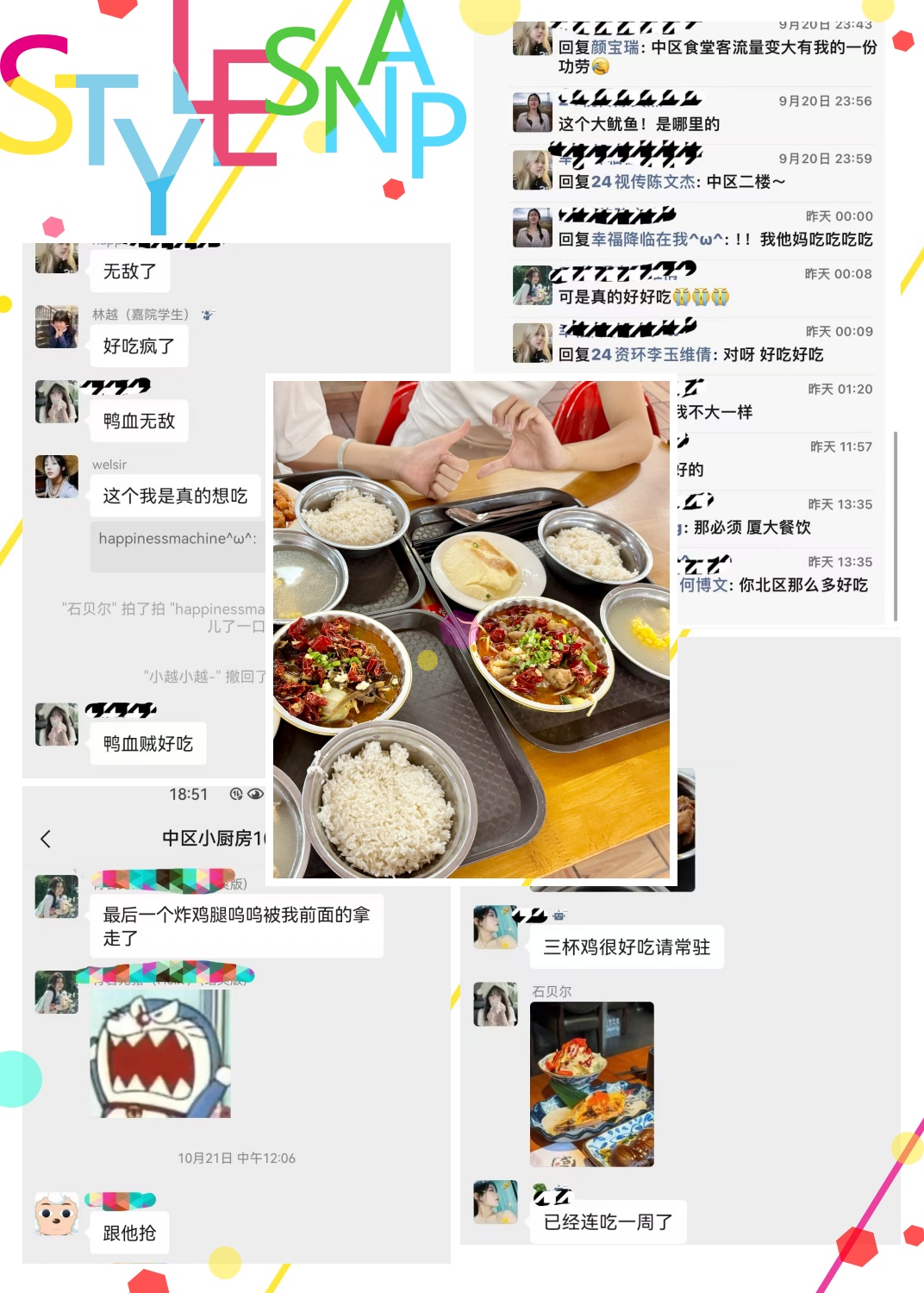 本次“美食周”活动满足校区师生对于餐饮更高品质的需要,通过餐厅厨师的鉴与学,在校区师生的品与尝上发力,展现了食以载道的广与深,获得了校区师生的一致肯定。甚至还有同学专门为美食节撰写了“美食指南”,用手机拼出多个美食九宫格炫耀到朋友圈;大家聊着明天最期待的特色小吃,感慨每天能吃到不同的特色菜,就像在家里一样被食堂“宠爱”着,希望这样能同时的满足吃货的胃和心灵的美食活动可以再多些,还有同学念及食堂员工早早准备这么多美味佳肴的不易,向他们道声辛苦了……
