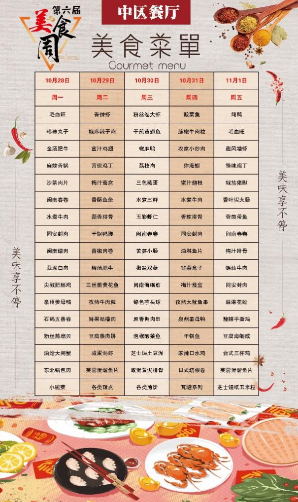 为丰富校园饮食文化,落实“两增一降”工作要求,切实为师生员工办实事,近日,中区餐厅举办第六届“美食周”活动,与校区师生相约中区餐厅二楼,共赴人间烟火,畅享味蕾与文化的双重盛宴,共度美好“食”光。