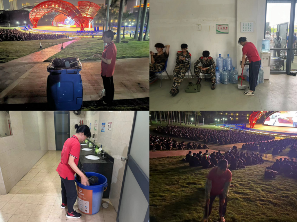 校园服务部做好军训期间分兵、军训结业典礼、系列讲座等会场准备及各项后勤保障工作,并增派保洁人员根据学生训练安排及时有效做好现场保洁和环境美化工作,为参训学子们提供了一个干净、整洁、舒适的训练环境。这份辛勤与努力,让军训期间的校园更加美丽动人。