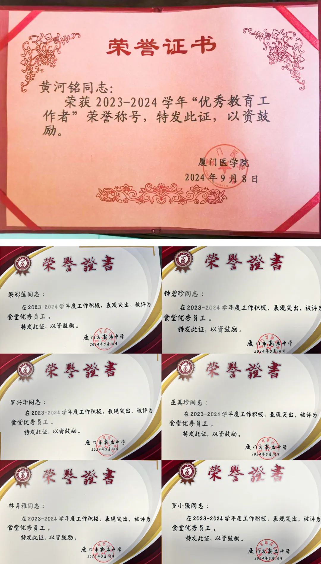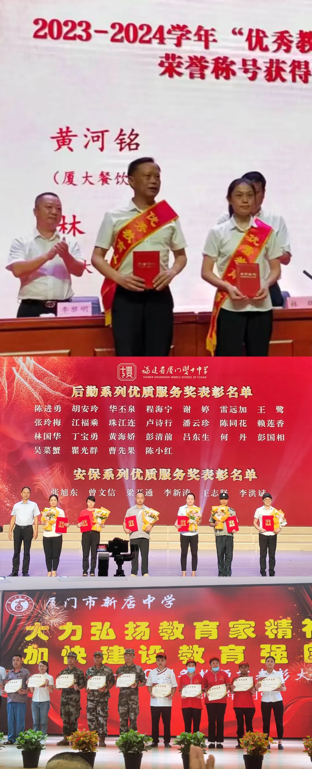 与此同时,值此教师节之际,厦门医学院、双十中学、厦门市新店中学在优秀教师表彰大会上,为日常辛勤服务广大教师的“厦大餐饮”后勤人员颁发奖状,授予陈进勇等“后勤先进个人”称号,黄河铭“优秀教育工作者”荣誉称号,授予钟碧珍 、罗小强、林月雅、巫美珍、罗兴华、蔡彩莲“食堂优秀员工”荣誉称号。通过嘉奖,以此表达学校对“厦大餐饮”人勤恳奉献、优质服务的认可和鼓励!
