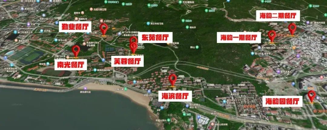思明校区:勤业餐厅、芙蓉餐厅、东苑餐厅、南光餐厅、海滨餐厅、海韵学生公寓第一餐厅、海韵学生公寓第二餐厅、海韵园餐厅。